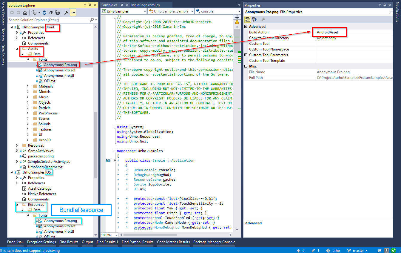 }我遇到的问题是,我没有这种字体,而且它没有包含在任何类型的资产文件夹中,也没有包含在他在/UrhoSharp.Demo的演示项目的任何/UrhoSharp.Demo存储库中。事实上,尽管函数调用中提到了一个“字体”文件夹,但在他的演示解决方案中,任何一个项目中都没有字体文件夹。