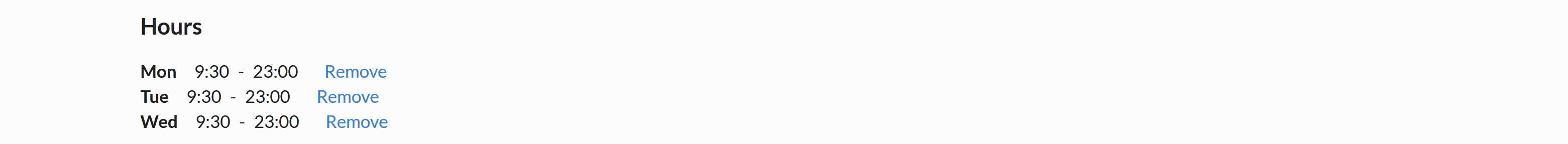 <div class="mb-0"><span class="mr-2"><strong>Mon</strong></span><span class="mr-1">9:30</span><span class="mr-1">-</span><span>23:00</span><a class="ml-3" href="#">Remove</a><input type="hidden" name="BusinessHours" value="0 0930 2300"></div>