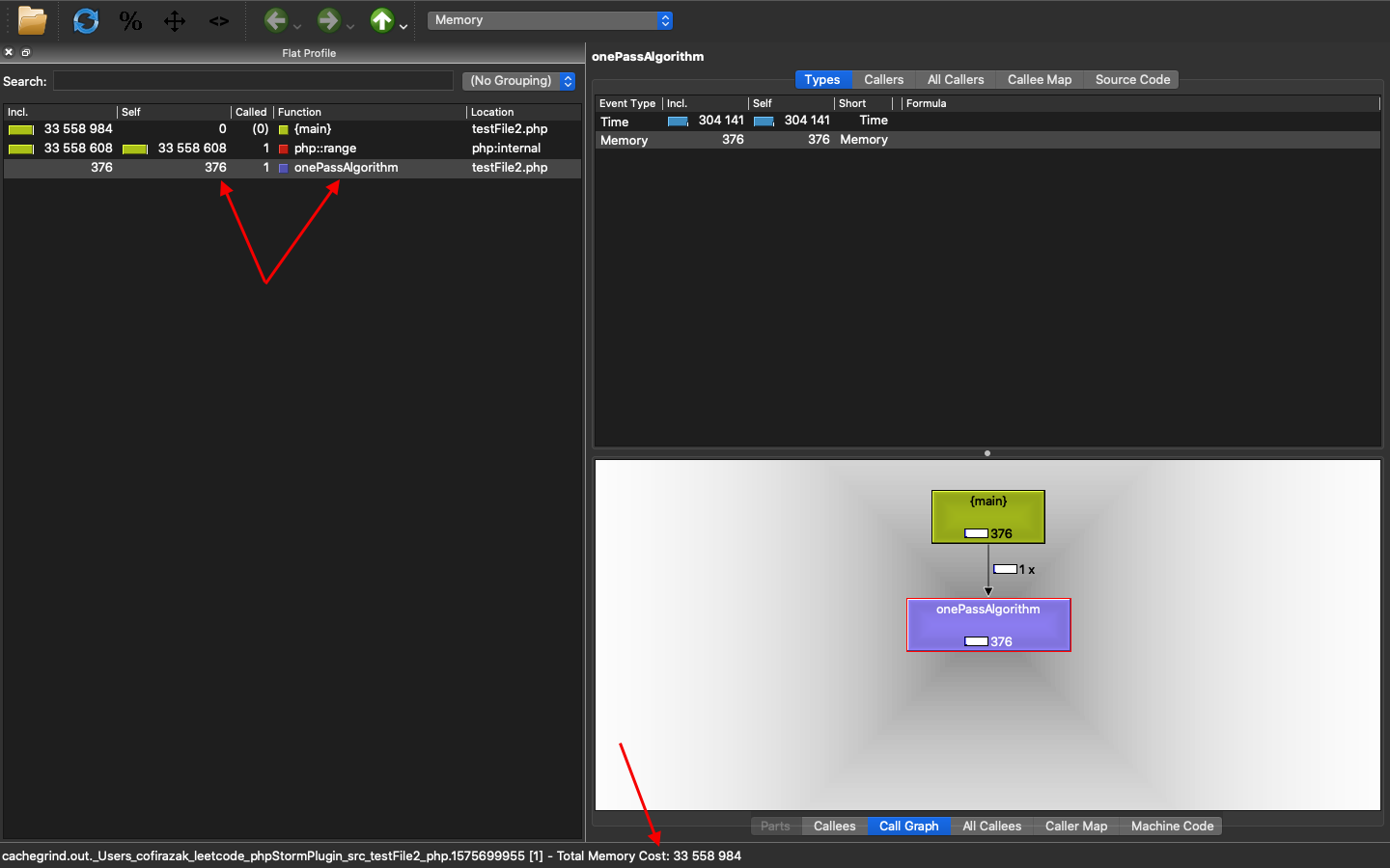 $result = onePassAlgorithm($range, 1_999_999);在qcachegrind中,我们可以看到onePassAlogorithm函数只使用376字节(返回语句的大小)。难道我们不需要更多的顺序保存在$seen_nums变量中吗?那么,空间复杂度是O(1)吗?