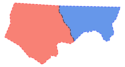 然而,要做到这一点,则需要实际共享边界线--这样就可以完美地重叠。我怀疑沿着共享边界看上去有趣的破折号可能是因为边界被不太重叠的部分分割开了。下面的代码显示了正在发生的事情:边界不是完全覆盖的,所以交集不包括整个边界。将lty=2应用于结果给出了一组短行,每条短线都会再次启动虚线序列,从而导致交错间距。