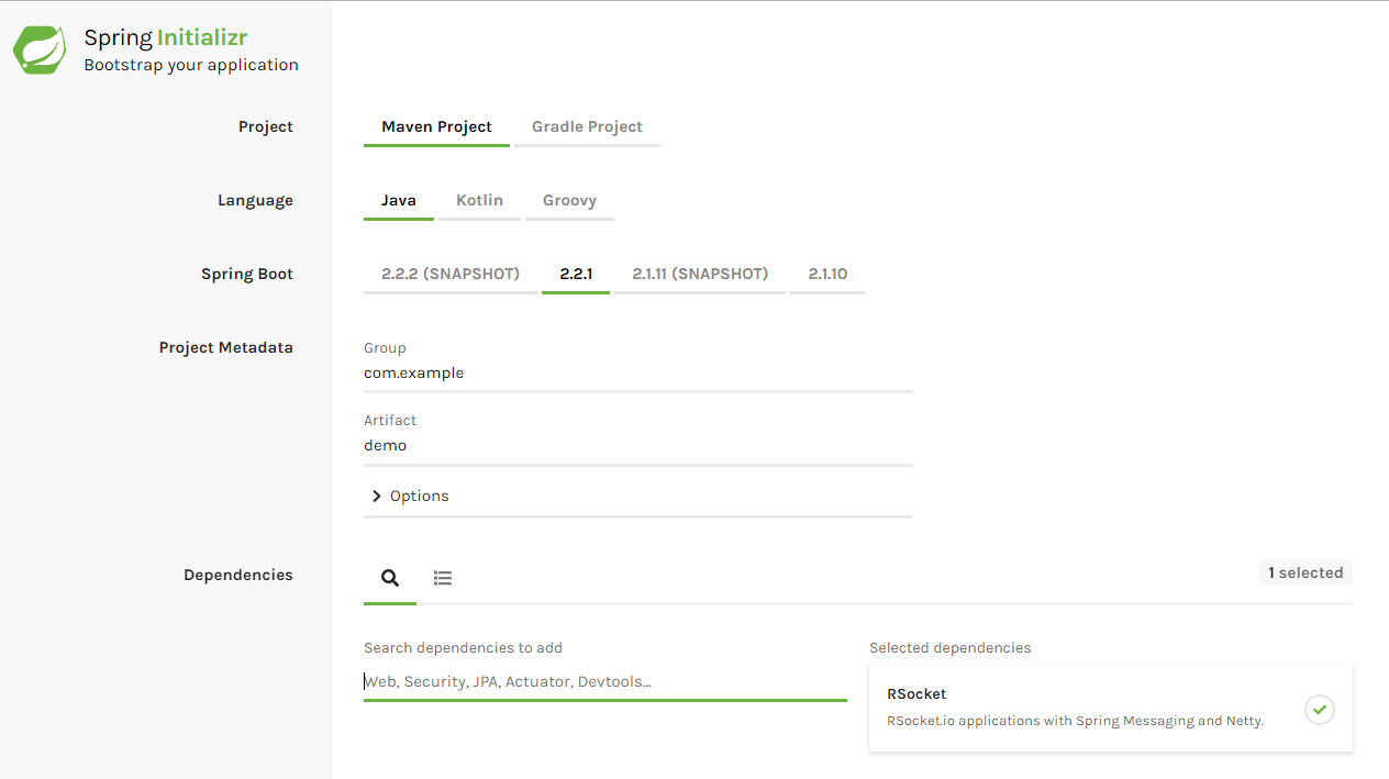 我只是使用RSocket初学者选择了一个springboot应用程序示例: