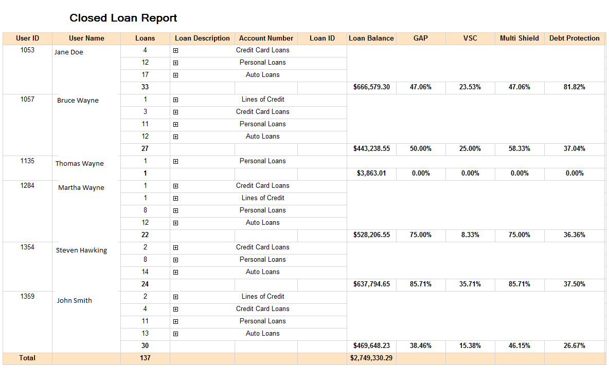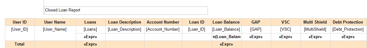 =(sum(Fields!Debt_Protection.Value)) / sum(max(Fields!Loans.Value, "Loans"))获取债务保护列的和,并将其除以贷款组的总和(因为有多个组)。我不知道如何得到个人贷款和汽车贷款的总和,而不是整个贷款组。我在想也许我该用个SUMIIF。