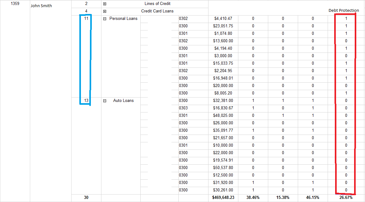 我想把债务保护(红色)栏中的所有1加起来,然后除以汽车贷款和个人贷款之和(蓝栏)。