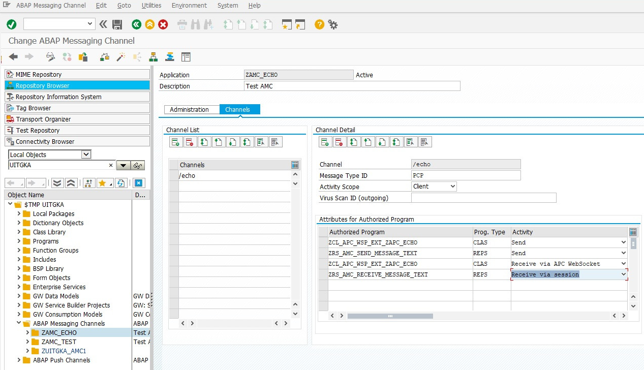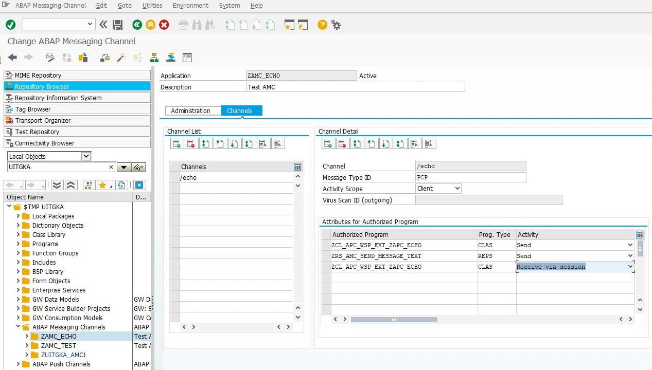 其背后的想法是从授权程序选项卡中删除报表接收者,并将其再次替换为APC接收类,只是这次定义为“接收通过会话”,这样我就可以从发送方报告接收消息并将其转发给客户端。调用SAPUI5应用程序,按预期与APC通道打开连接,调用后端报告,消息由发件人应用程序正确发送(sy-subrc = 0,无一例外),但似乎没有任何进展,因为a)客户机中什么都没有出现,而b) (最重要的) on_message类方法中的断点未被击中(方法未调用)。