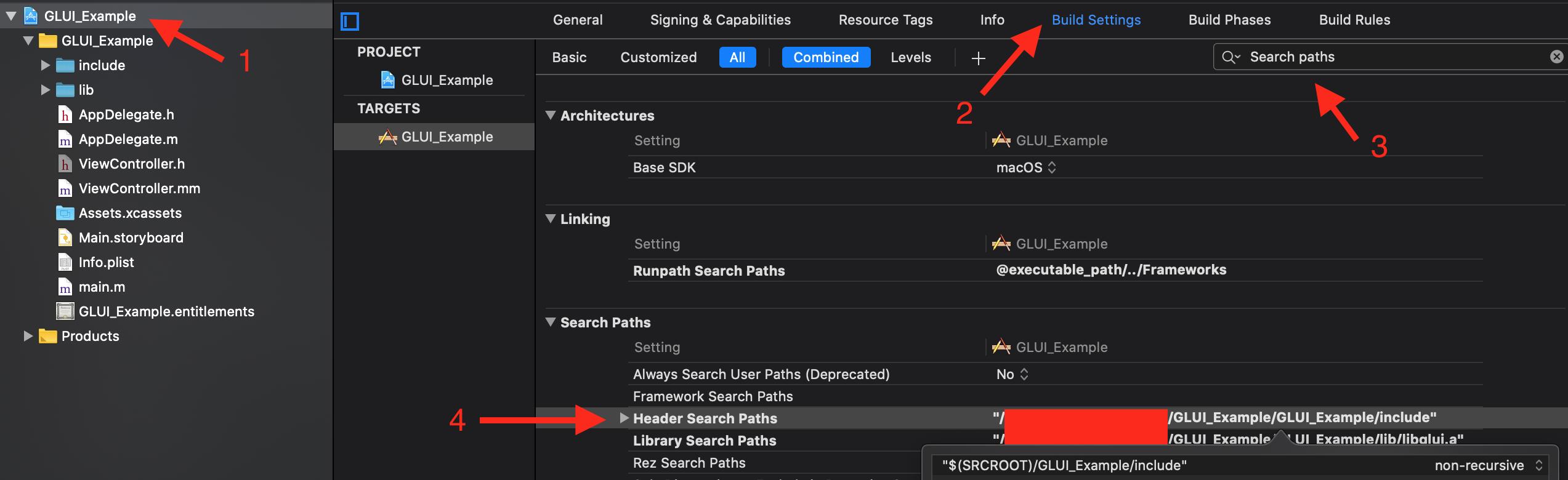 如果Xcode没有看到指向库的包含或链接,则必须将它们添加到搜索路径(标头和库)中,如下所示: