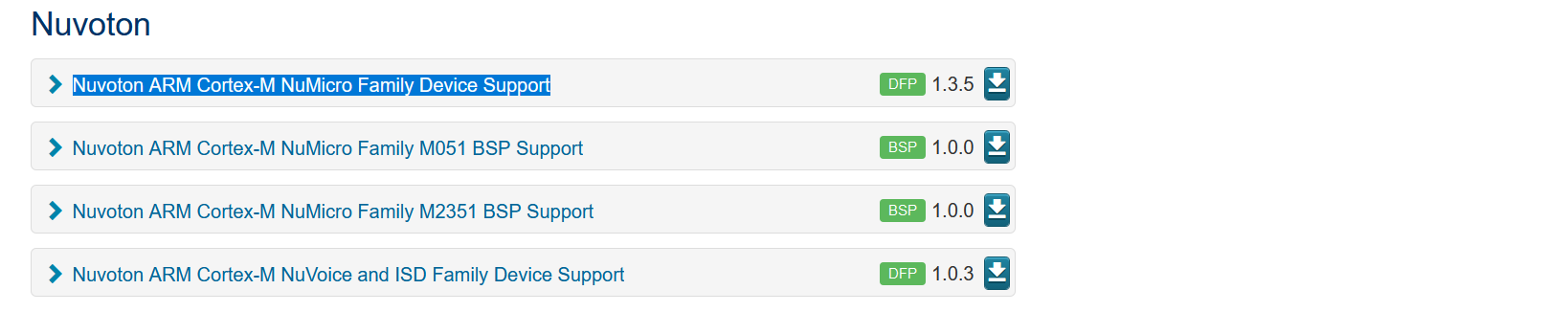 PyOCD有几个内置目标。但不是我得到的努沃顿芯片。因此,我查阅了https://github.com/mbedmicro/pyOCD/blob/master/docs/target_support.md的文档,并了解到我需要从http://www.keil.com/dd2/pack/下载一个pack。这就是我下载Nuvoton ARM Cortex-M NuMicro Family Device Support包的地方: