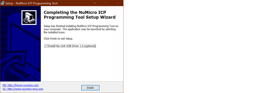 这个板的右侧有一个Nu-Link2-MV1.0探针。当我第一次把我的板子连接到我的电脑上时,什么也没有发生。因此,我想我必须安装Nuvoton ICP工具,它附带了Nu-Link USB驱动程序1.6。