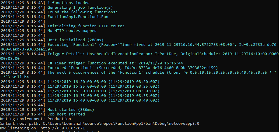 log.LogInformation($"C# Timer trigger function executed at: {DateTime.Now}");