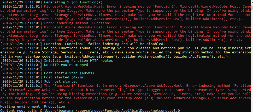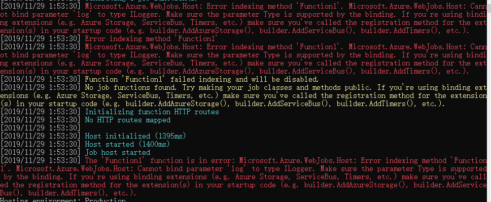 29/11/2019 1:08:35上午'Function1‘函数出错: Microsoft.Azure.WebJobs.Host:错误索引方法’function 1‘。Microsoft.Azure.WebJobs.Host:无法将参数'log‘绑定到ILogger`1 `1类型。请确保绑定支持参数类型。如果使用绑定扩展(例如Azure存储、ServiceBus、计时器等)确保您已经为启动代码中的扩展调用了注册方法(例如builder.AddAzureStorage()、builder.AddServiceBus(),