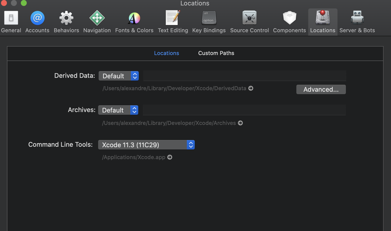 }诀窍不是修补这个文件,而是首先正确地设置xcode配置,Xcode > Preferences > Locations (见图)