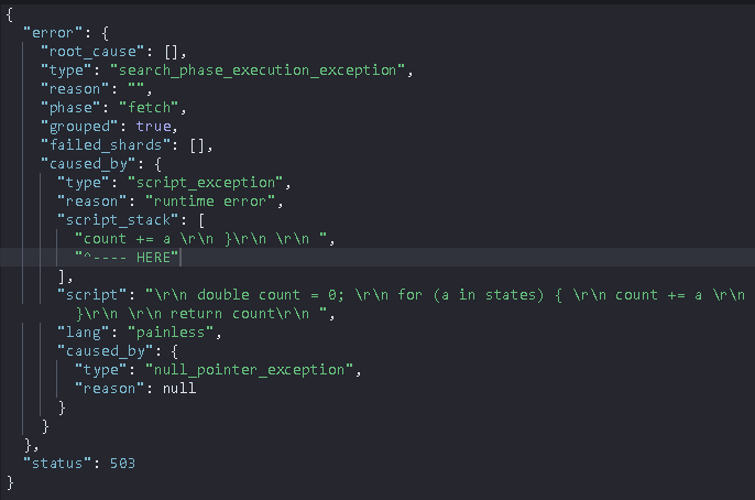 如果脚本化度量聚合的父桶不收集任何文档,则将从带有空值的碎片返回空聚合响应。在这种情况下,减脚本的状态变量将包含null作为来自该碎片的响应。因此,reduce_script应该期望并处理来自碎片的空响应。