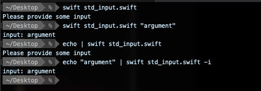 swift main.swift应该输出“请提供一些input"swift main.swift argument应该输出"argument"echo | swift main.swift应该输出”请提供一些input"echo argument | swift main.swift应该输出“参数”在复合echo argument1 | swift main.swift argument2的情况下,argument2优先。