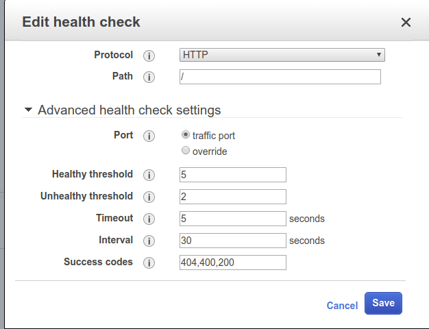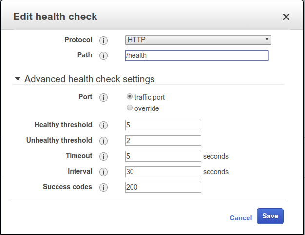 默认情况下,阿波罗支持在此URL /.来源上进行简单的健康检查,因此您可以将目标组中的路径从/更改为URL。