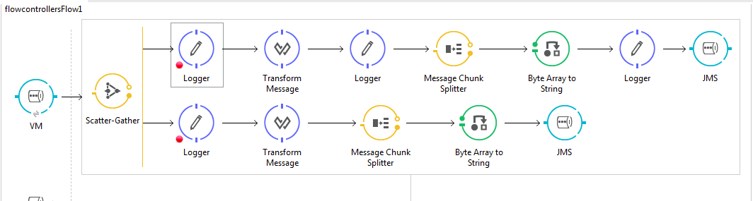 在将一个副本转换为csv数据并将另一个副本转换为固定长度后,将json数据提供给分散采集器并向两个消息块拆分器发送消息,并将“启用相关id”设置为“始终”选项。但是mule消息块拆分器将相同的Mule_Correlation_id设置为json和csv数据,而这又与正常的"correlation_id“相同,即使我将启用关联id设置为”始终“选项,也不明白为什么会发生这种情况。这是流程的屏幕截图。