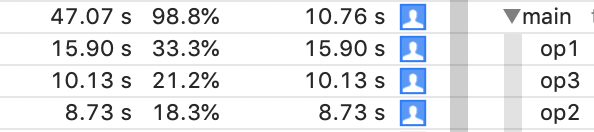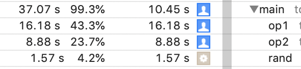 }我在同一个循环中调用原始版本(op1)和我的版本(op2),并在1.0、1.0之间使用相同的随机输入来测试这一点。这两个函数返回相同的值。通过对超过1亿次循环迭代的代码进行分析,我得到了以下结果: