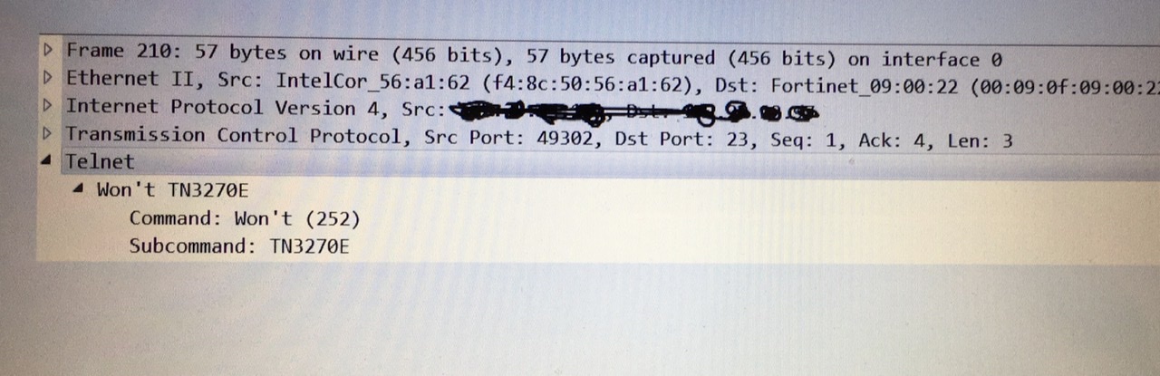 当我通过PCOMM模拟器连接到AS400时,在网络流量(使用Wireshark)中,从源(客户端)到目的地(服务器AS400)的telnet协议显示为Will TN3270E,而我使用TN5250j仿真程序连接AS400在telnet协议中显示为习惯TN3270E