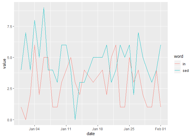 case_insensitive = TRUE)现在,dfm有许多优点,但是与其他工具一起使用它通常意味着我们需要首先将它转换为其他对象。这似乎松散了日期信息,但我们可以简单地在矩阵转换为data.frame之后重新附加它。