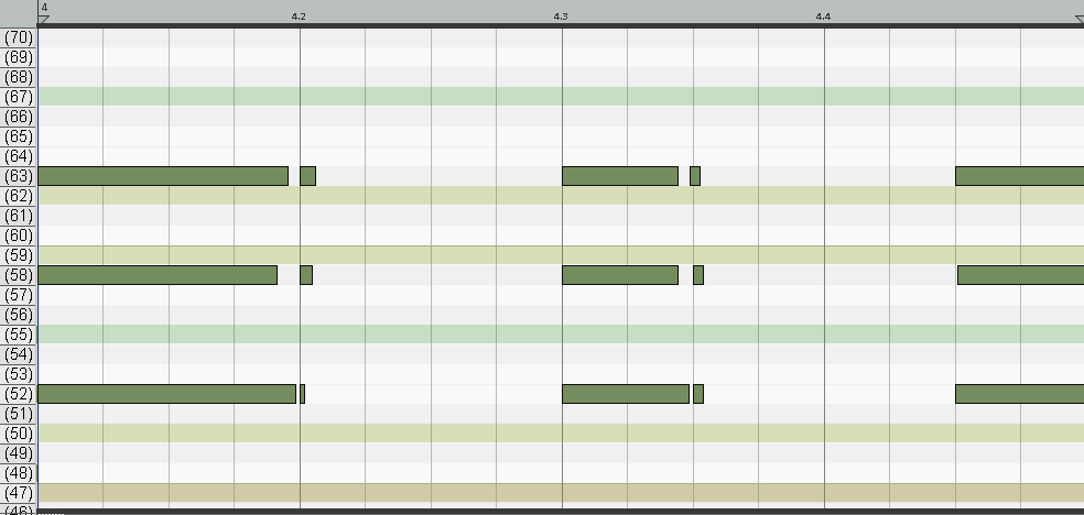 63 68所以我可以改变音符的音高值,使它们与另一个有和弦音符的表的音高值相匹配。所以: 52至55,58至59,63至62