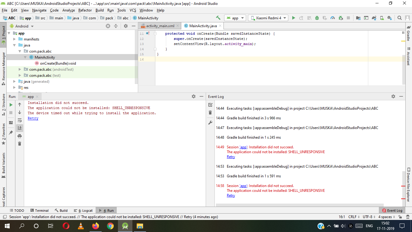 我的工作是安卓工作室3.5.2版本。昨天天气很好。但是今天连空白的活动都没有在我的物理设备上运行--小米红米4。我已经更新了驱动程序,重新启动了Android,USB调试已经启动,甚至出现故障。我已经检查过任何更新,它是更新的。快跑了。我多次做过“清洁工程”和“重建工程”。在我的设备上运行需要花费太多时间,因此设备被超时了。早些时候,这不是问题所在。该怎么办呢?为什么突然出了这个问题?