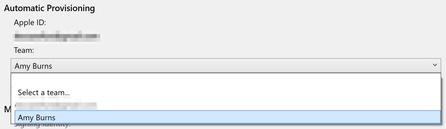 在开始自动签名过程之前,应确保在Visual中添加了Apple,如苹果账户管理指南所述。一旦添加了Apple ID,就可以使用任何相关的团队。这允许针对团队创建证书、配置文件和其他ID。team ID还用于为应用程序ID创建前缀,该前缀将包含在供应配置文件中。有了这一点,苹果就可以验证你是你所说的那个人了。
