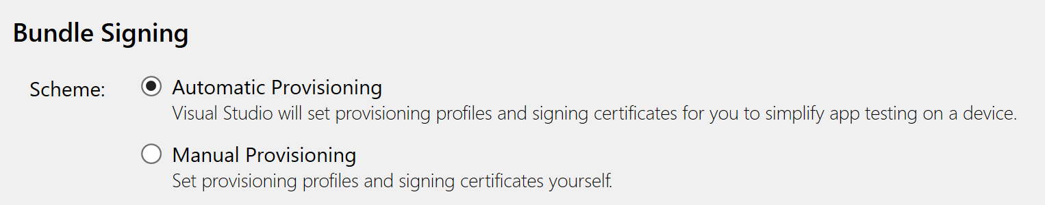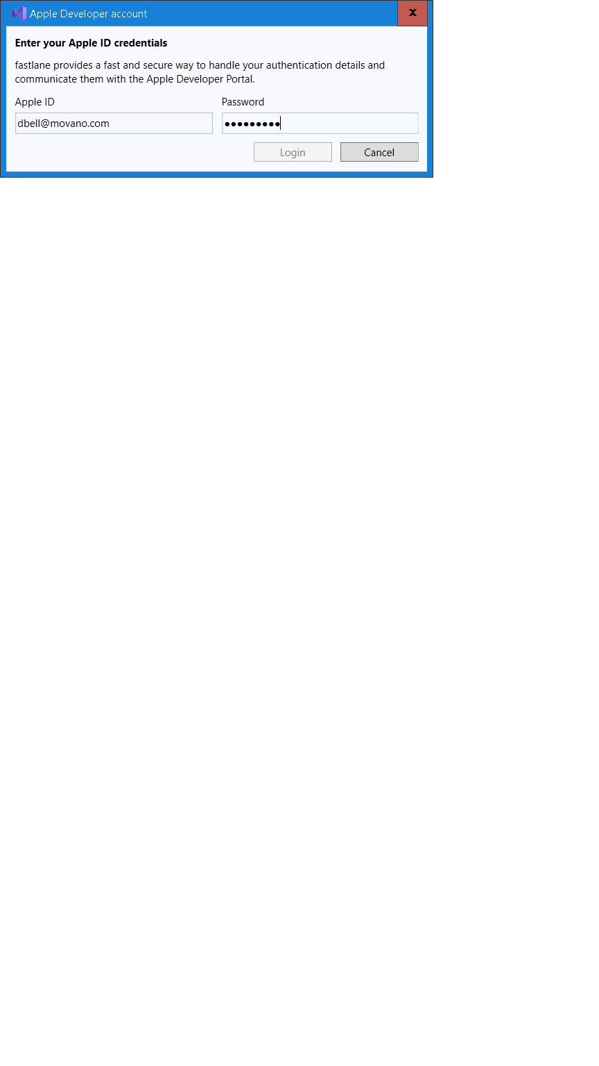 我使用VisualStudio2019创建了一个新的xamarin.ios项目。转到项目的属性并选择自动配置。转到工具选项Xamarin > Apple Account>添加并输入我的Apple和密码,然后挂起。