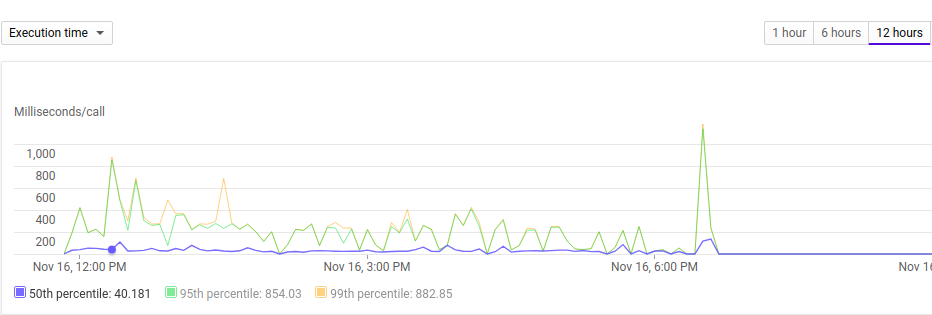 当我在GCP上执行CF时,它在4个参数上有图。调用、活动实例很容易理解数据试图表达的内容。但我无法理解其他图形,即执行时间和内存使用情况。这是我们的一个http触发的 CF的屏幕截图。有人能解释一下如何准确地理解这些数据吗?CF的意思是,第99百分位数: 882.85