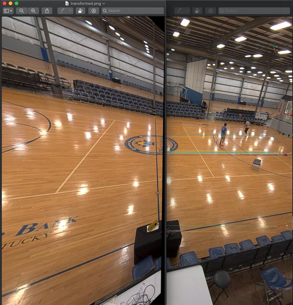 一旦镜头畸变被纠正,第二个问题是两片中的同一行指向不同的方向,这应该用一个简单的透视变换来校正。因此,我开始了一个长期的探索,为这个透视图转换找出合适的参数。