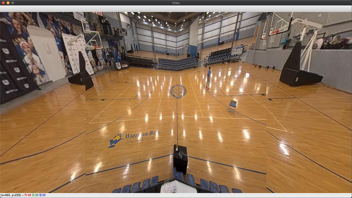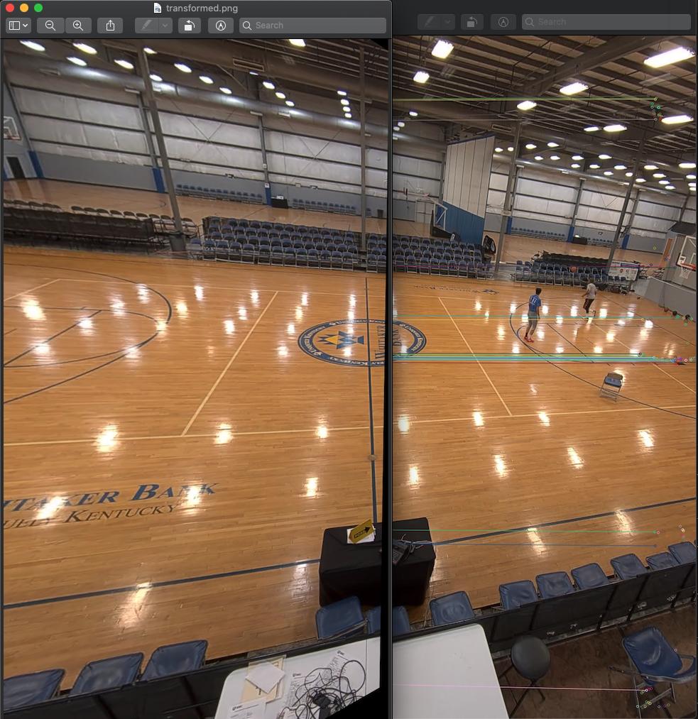 最终,当所有这些都说了,做了,我想尝试计算一个从输入像素到输出像素的映射,这样我们就不会在每帧中做所有的复杂工作(镜头校正,ORB,findHomography等)。我们将在每台摄像机上完成一次,将映射保存到某个文件中,然后我们可以使用cv2.remap实时地将输入视频映射到输出视频帧。