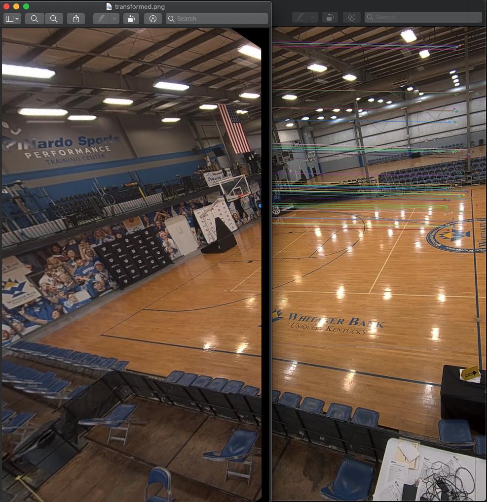 我更新了我的特征检测,以消除任何匹配的Y坐标有很大差异(例如,匹配白色的表和白色的灯光)。在此基础上,我的匹配特征从110下降到55,但同源性有了明显的提高。下面是对切片1/2和2/3进行更新的结果: