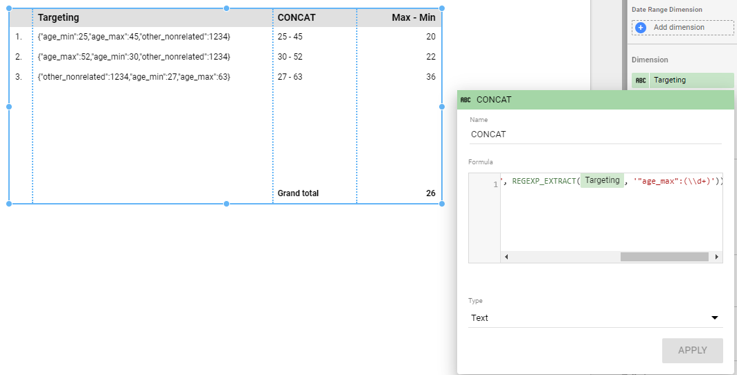 CONCAT(REGEXP_EXTRACT(Targeting, '"age_min":(\\d+)'), " - ", REGEXP_EXTRACT(Targeting, '"age_max":(\\d+)'))使用公式更新的报告图像: