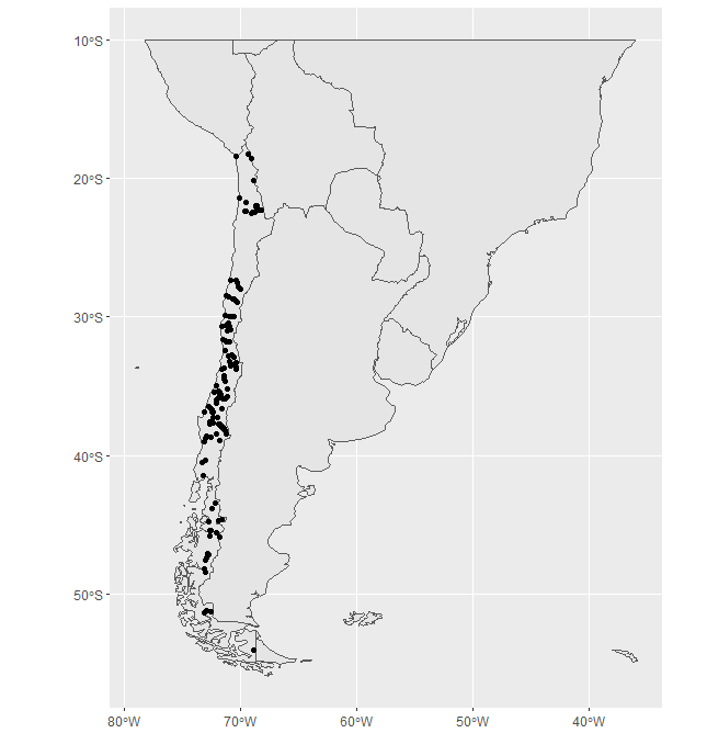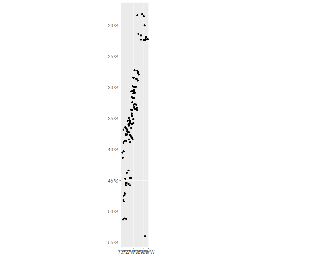 下面的代码使用简单特性(sf)库来显示覆盖了提供的数据点的智利地图。包围框在参数中被设置为st_crop,并且可以根据需要进行调整,而不失真地图。代码使用行政0-国家形状文件,该文件位于公共域中,可以免费使用。