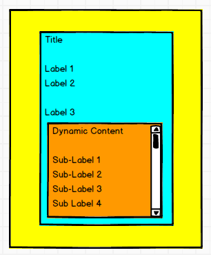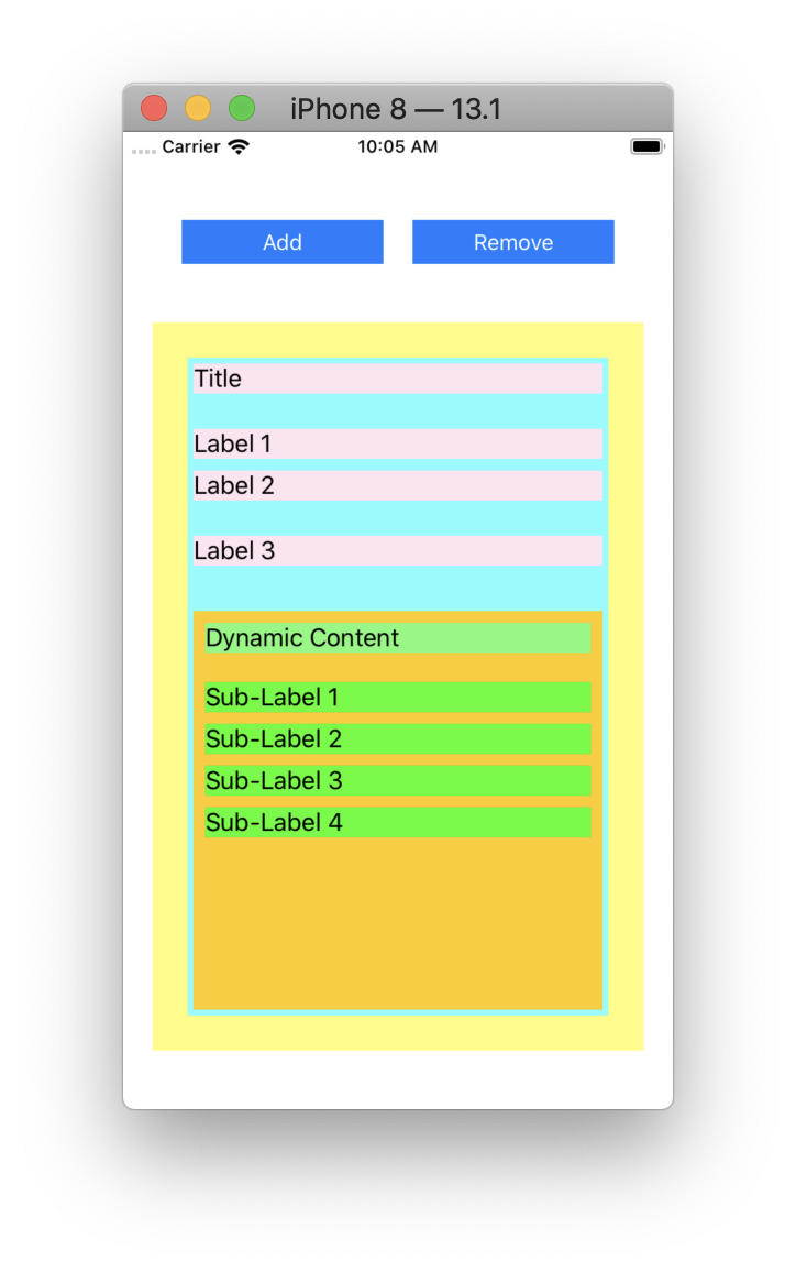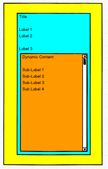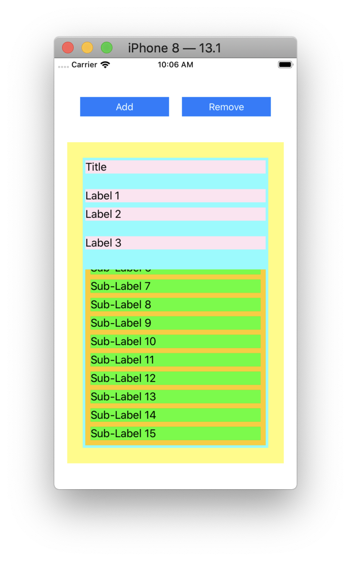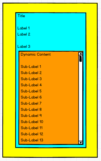 然后,在StackView中需要一个ScrollView (橙色)(垂直滚动),在运行时添加子视图(在1到20个标签之间)。此ScrollView应占用视图的所有剩余空间,并且最低高度为100 up。