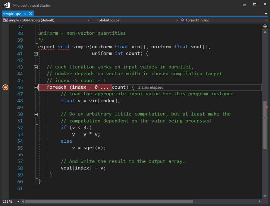 最新版本的ispc (1.9.2)支持使用Visual进行有限的调试。用bool's检查结构体似乎不起作用,本地窗口很不稳定,但或多或少地起作用了。一步一步的工作。分析工作,但似乎有点不确定。