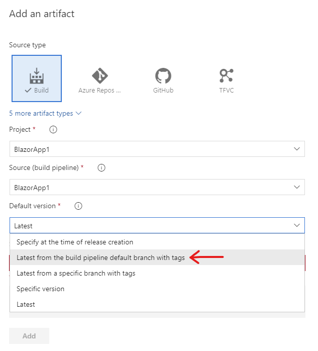 当添加源类型" build“的工件时,选择"Default version”作为“build管道默认分支的最新版本”,如下所示: