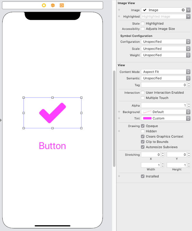 我使用Interface创建了一个简单的视图控制器,它包含一个UIImageView和UIButton。在这两种情况下,我都把tintColor设为洋芋。