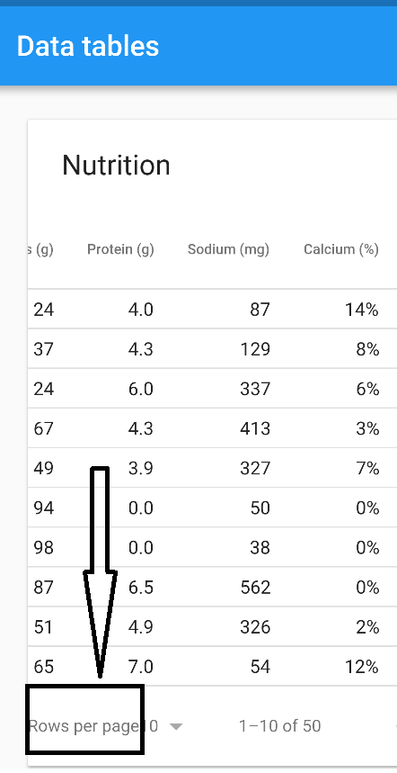 页脚中的文本不可编辑。作为解决办法,您可以通过在PaginatedDataTable上复制Widget来自定义自己的paginated_data_table.dart。页脚文本“每页行”是用rowsPerPageTitle定义的,可以位于footerWidgets上。