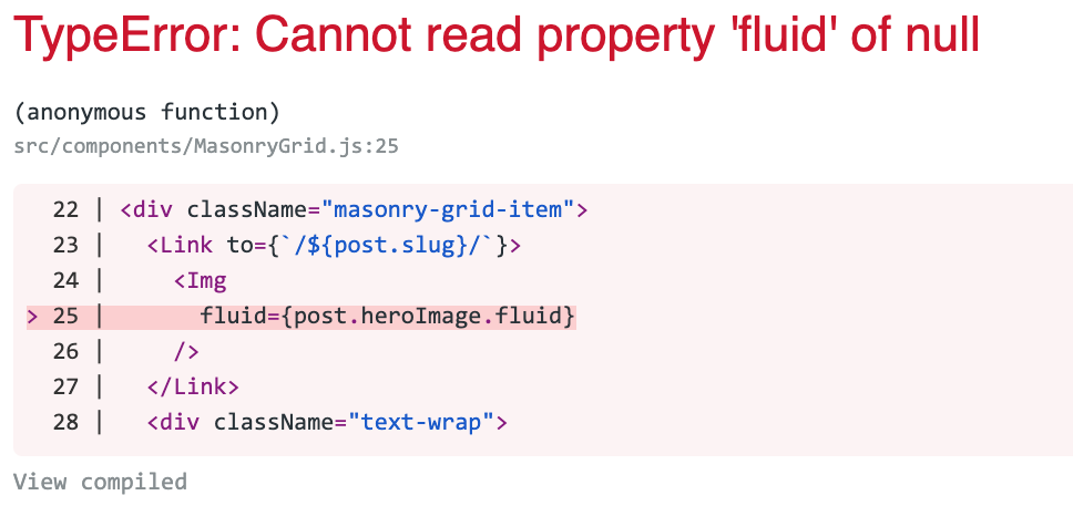 看起来您有一些没有heroImage字段的帖子。当您在没有heroImage字段的帖子上查询该字段时,该字段是null。