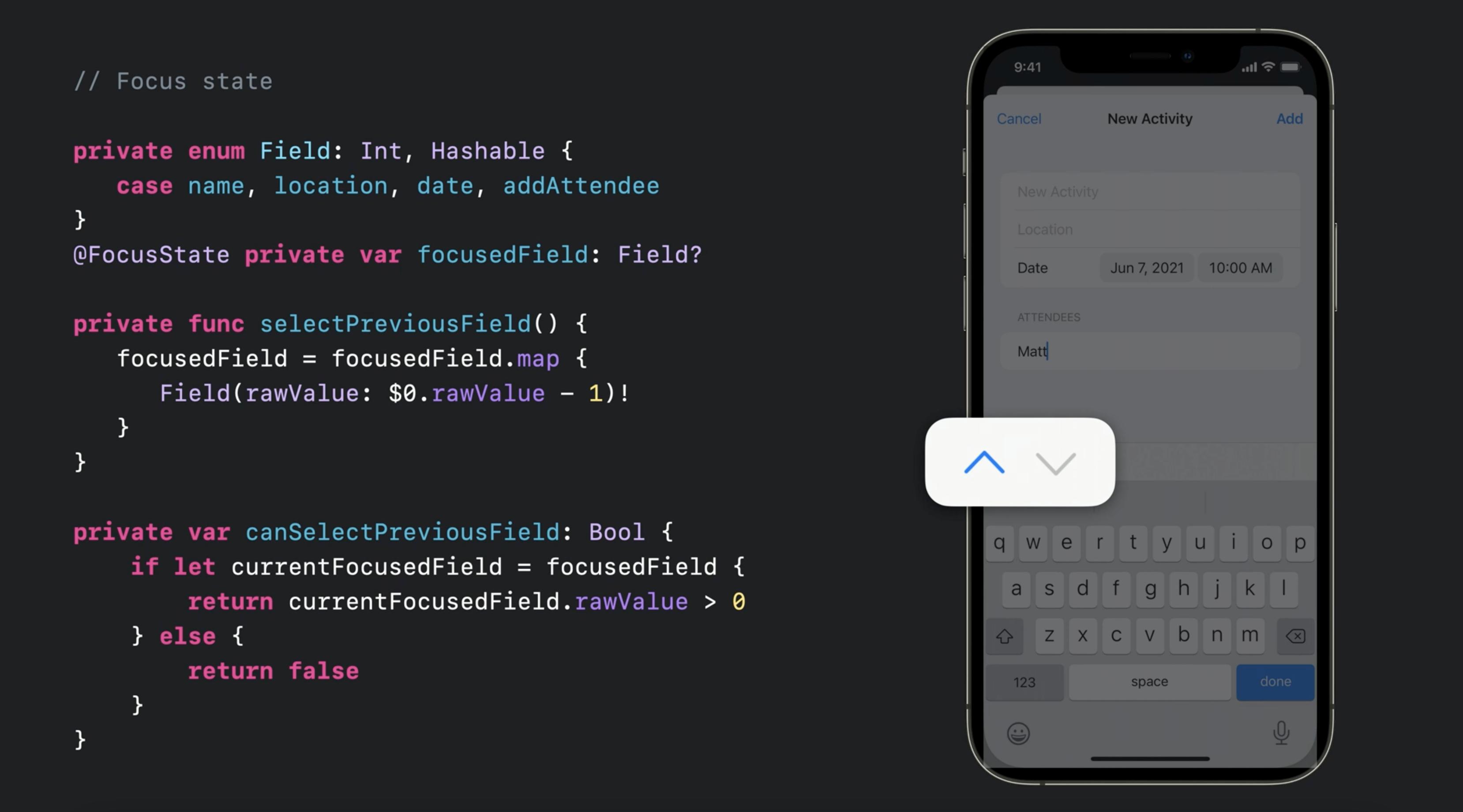 今年,苹果推出了一个新的修饰符,同时还推出了一个名为@FocusState的新包装器,用于控制键盘和聚焦键盘(又名firstResponder)的状态。