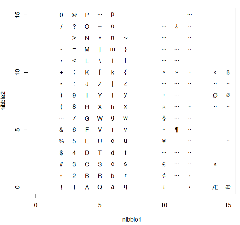 text(nibble1, nibble2, rawToChar(as.raw(0:255), multiple = TRUE))
