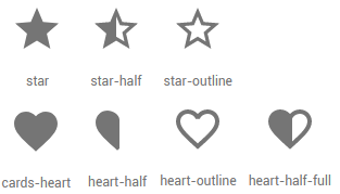 在第二行中,两个图标名都以-half结尾,但是star-half和heart-half非常不同。星星的左半部分被填满,而另一半则被勾画出来,而心脏实际上只是坚实的左半部分。