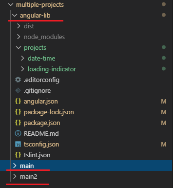 理想情况下,它们中的每一个都是独立的角度应用程序,并将使用我刚刚创建的库。文件夹结构如下图所示。注意到angular-lib,main和main2应用程序位于父文件夹multiple-projects中。