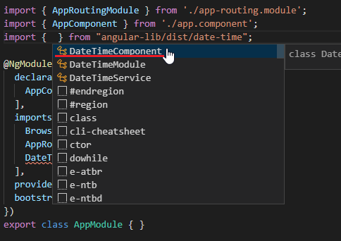 1. --我先去app.module.ts导入我的DateTimeModule库。我进入了DateTime,在VSCode上做了Ctrl + Space,但是根本没有任何建议。即使我输入了全名DateTimeModule,仍然没有导入建议。