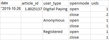 SELECT DATE, article_id, user_type, openmode, COUNT(DISTINCT uid) AS uids