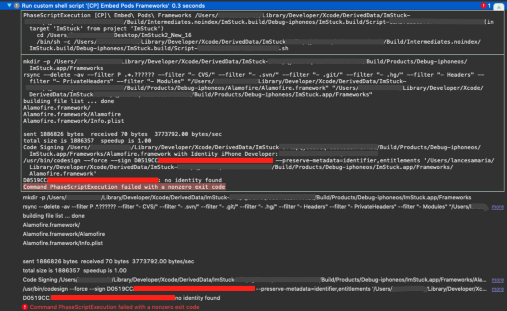代码: Lance (52Q24UJ38T) /usr/bin/codesign -强制-符号D0519CCxxxxxxxxxx -保存-元数据=标识符,应享权利'/Users/Home/Library/Developer/Xcode/DerivedData/ImStuck-...../Build/Products/Debug-iphoneos/ImStuck.app/Frameworks/Alamofire.framework‘D0519CCxxxxxxxxxx:没有身份发现命令PhaseScriptExecution失败,没有非零退出代码
