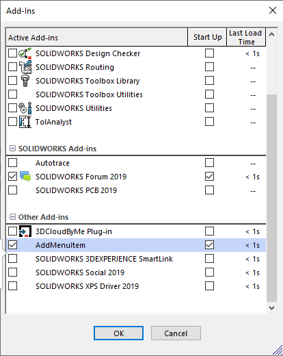 this.ThisSW.AddMenuItem3((int)swDocumentTypes_e.swDocPART, this.Cookie, "Item@&File", -1, "MyMenuCallback", "MyMenuEnableMethod", "My menu item", "");https://stackoverflow.com/questions/58570590