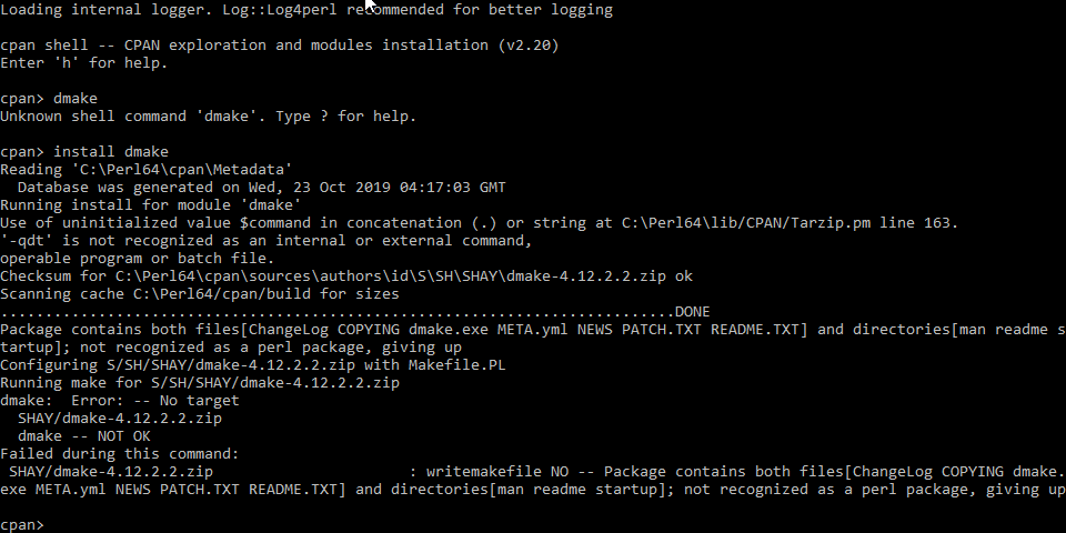 operable program or batch file.Cpan可以工作,但我不能安装像dmake这样的软件包
