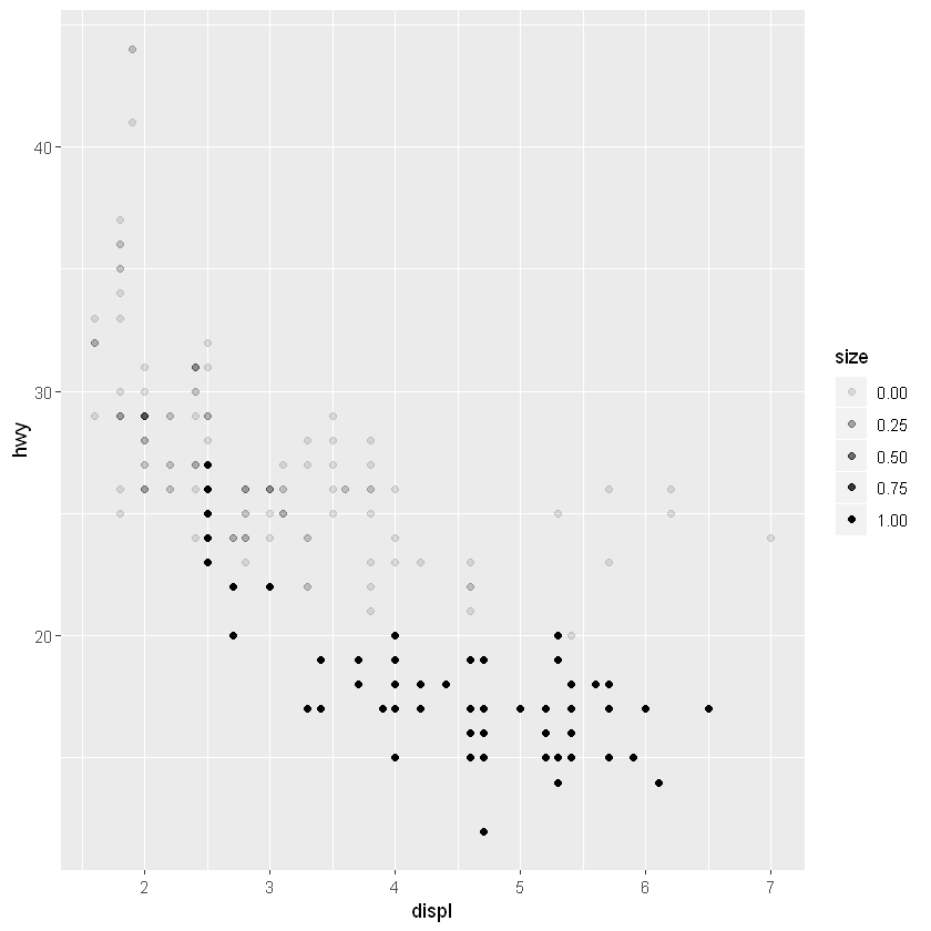 geom_point(mapping = aes(x = displ, y = hwy, alpha = size))现在,size只能接受两个值:1类为suv或pickup时,否则为0。但在结果的情节中,我得到了一个奇怪的“平滑”大小范围: