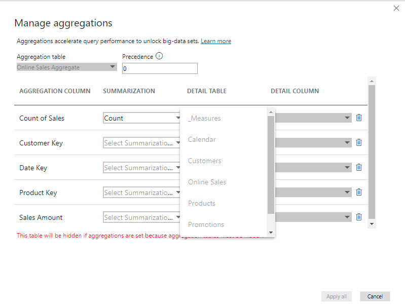 我正在尝试将名为“联机销售聚合”的表设置为聚合表。当我试图设置一个映射时,所有的明细表都会被禁用(参见下面)