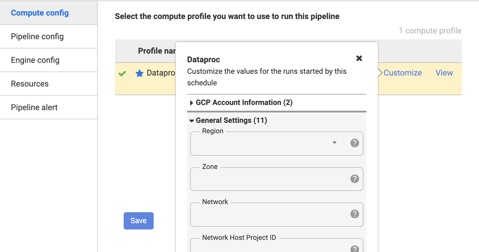创建新的计算概要文件仅在数据融合企业版中可用。在基本版本中,只能使用默认的计算概要文件。但您可以在运行管道时自定义配置文件。要做到这一点: