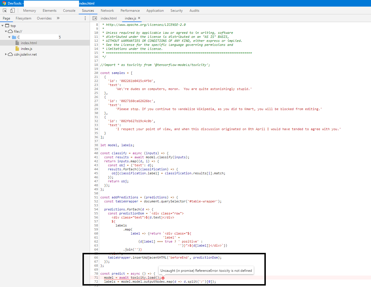 *我不知道您是否能够在jsbin看到代码问题,我使用了来自“index.html”的文件https://github.com/tensorflow/tfjs-models/tree/master/toxicity/demo和index.js,并在我的本地计算机中使用过。